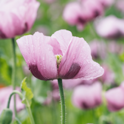 Eine Rarität in unserem Anbauspektrum ist der zartrosa blühende Schlafmohn (lat. Papaver Somniferum). Er stammt aus dem östlichen Mittelmeerraum und findet sich in unseren Breiten auf/in vielerlei Gebäck wieder. Wir bauen zwei von drei in Deutschland zugelassenen morphinarmen Sorten an. Eine Genehmigung hierfür mussten wir bei der Bundesopiumstelle einholen, die den Anbau streng überwacht und kontrolliert.